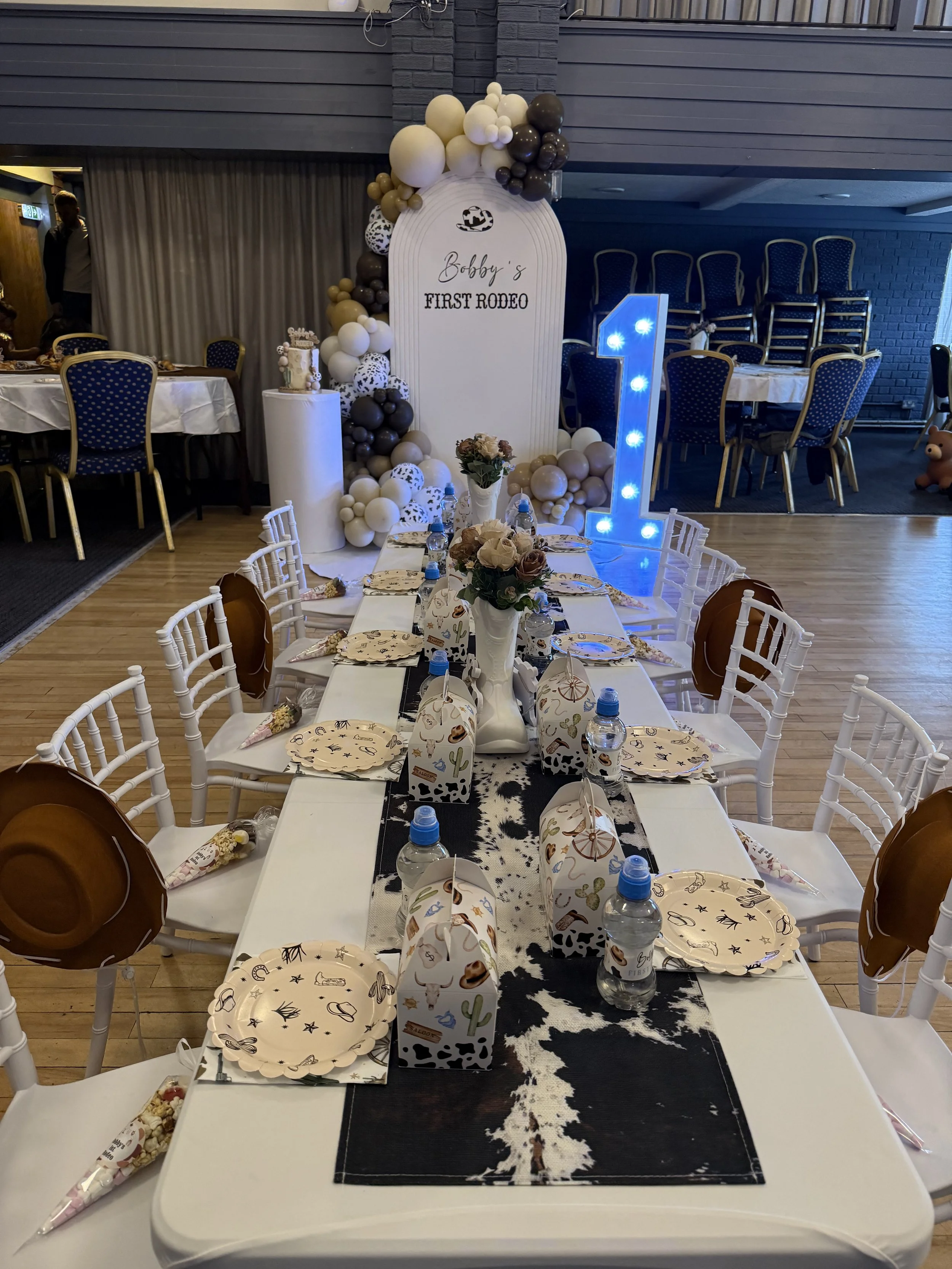 Chairs, tables, bows, table decor, personalised party boxes, personalised water bottles, personalised place mats
