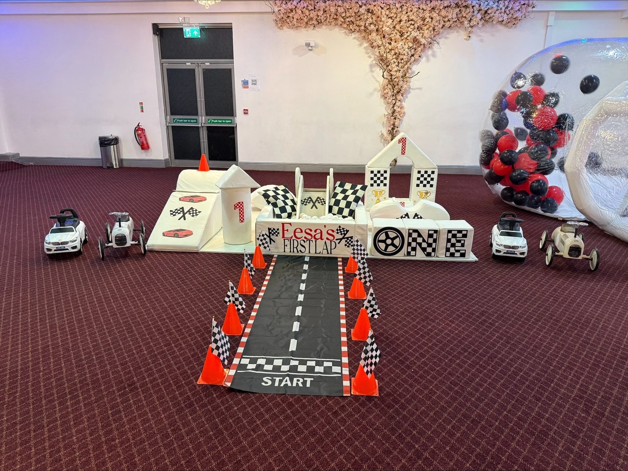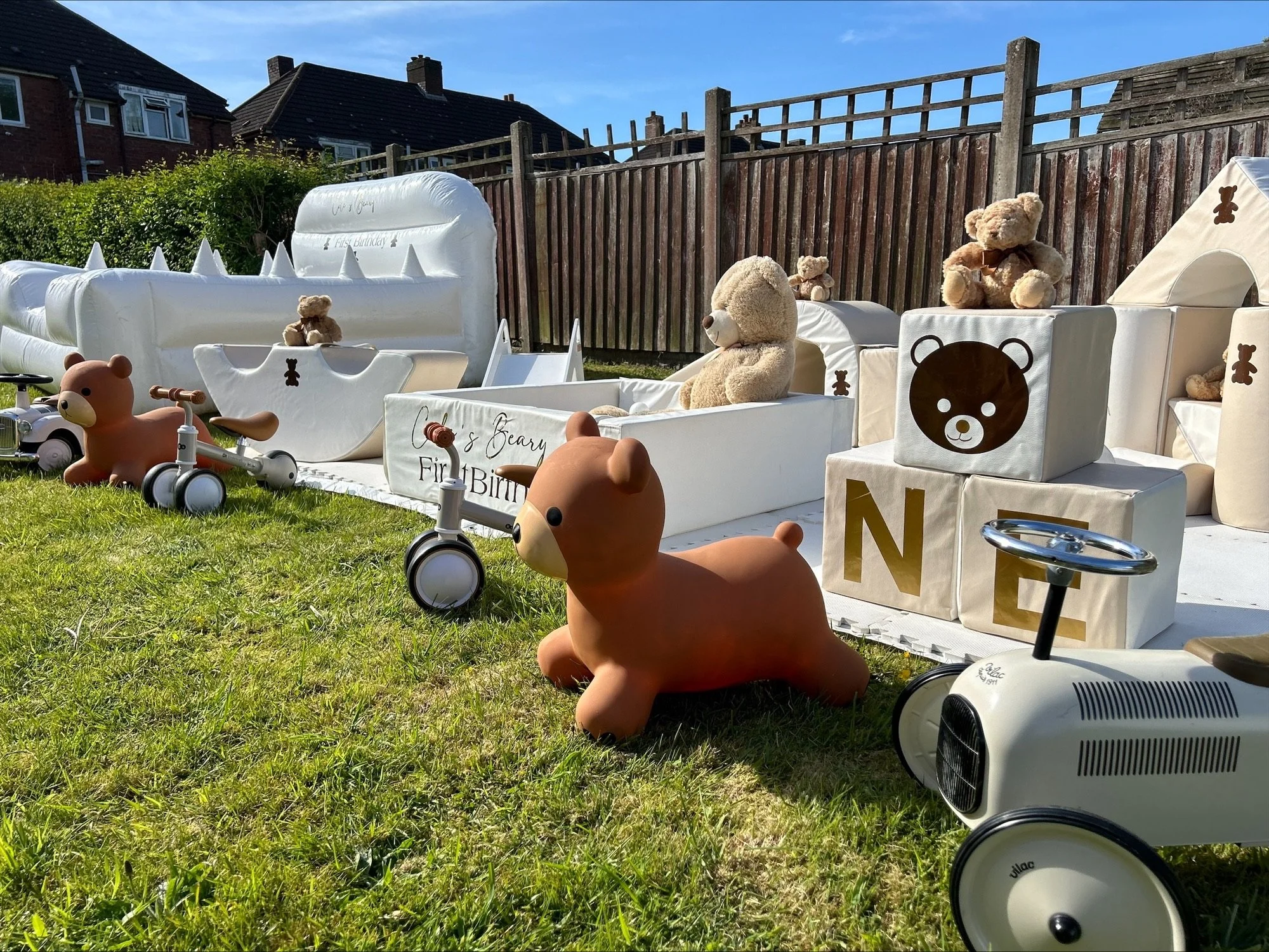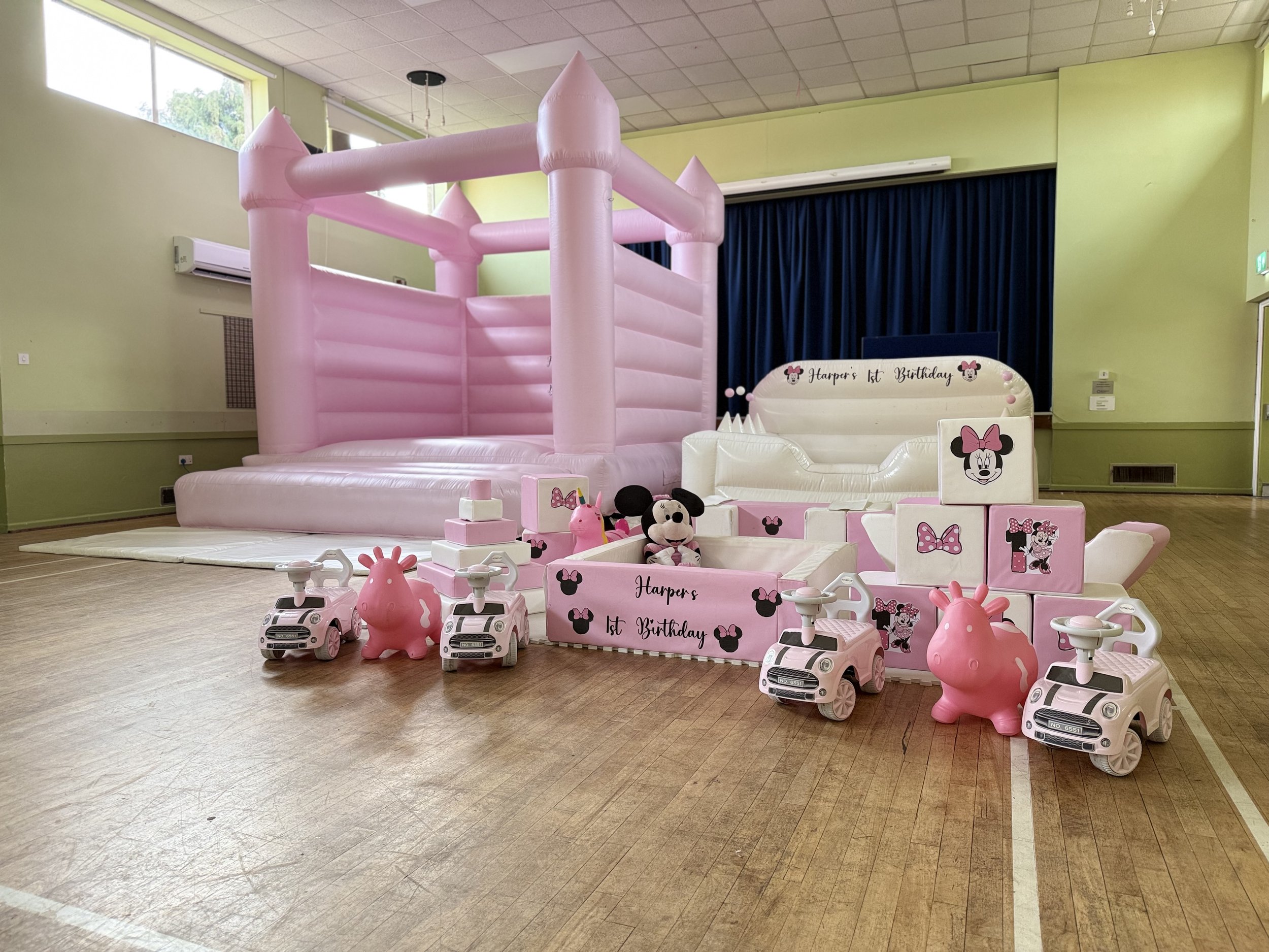 Seesaw 11, castle blocks & shapes, Hoop with steps & slide, 2 hoppers, 4 ride on’s, ball pit & balls, stacking blocks, mats.