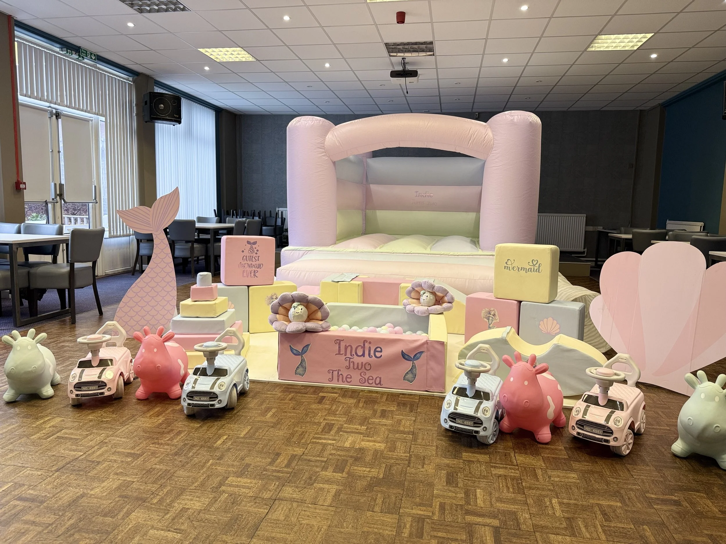 Seesaw 11, castle blocks & shapes, tunnel with steps & slide, 2 hoppers, 4 ride on’s, ball pit & balls, stacking blocks, mats.